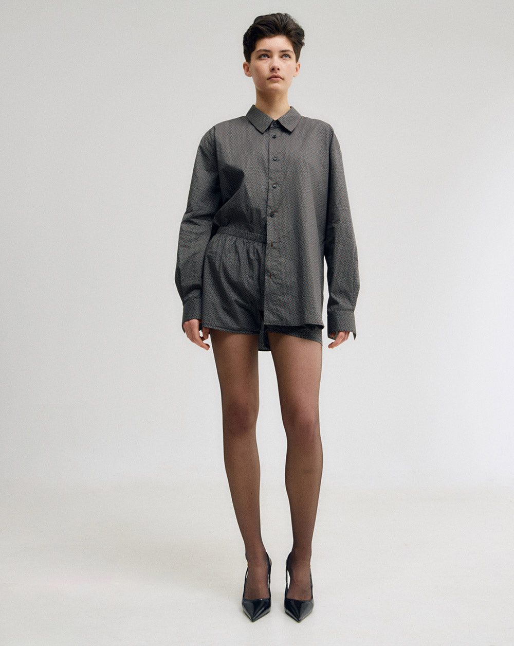 An oversized shirt with a box-pleated back yoke in a printed cotton with micro-tie motif.