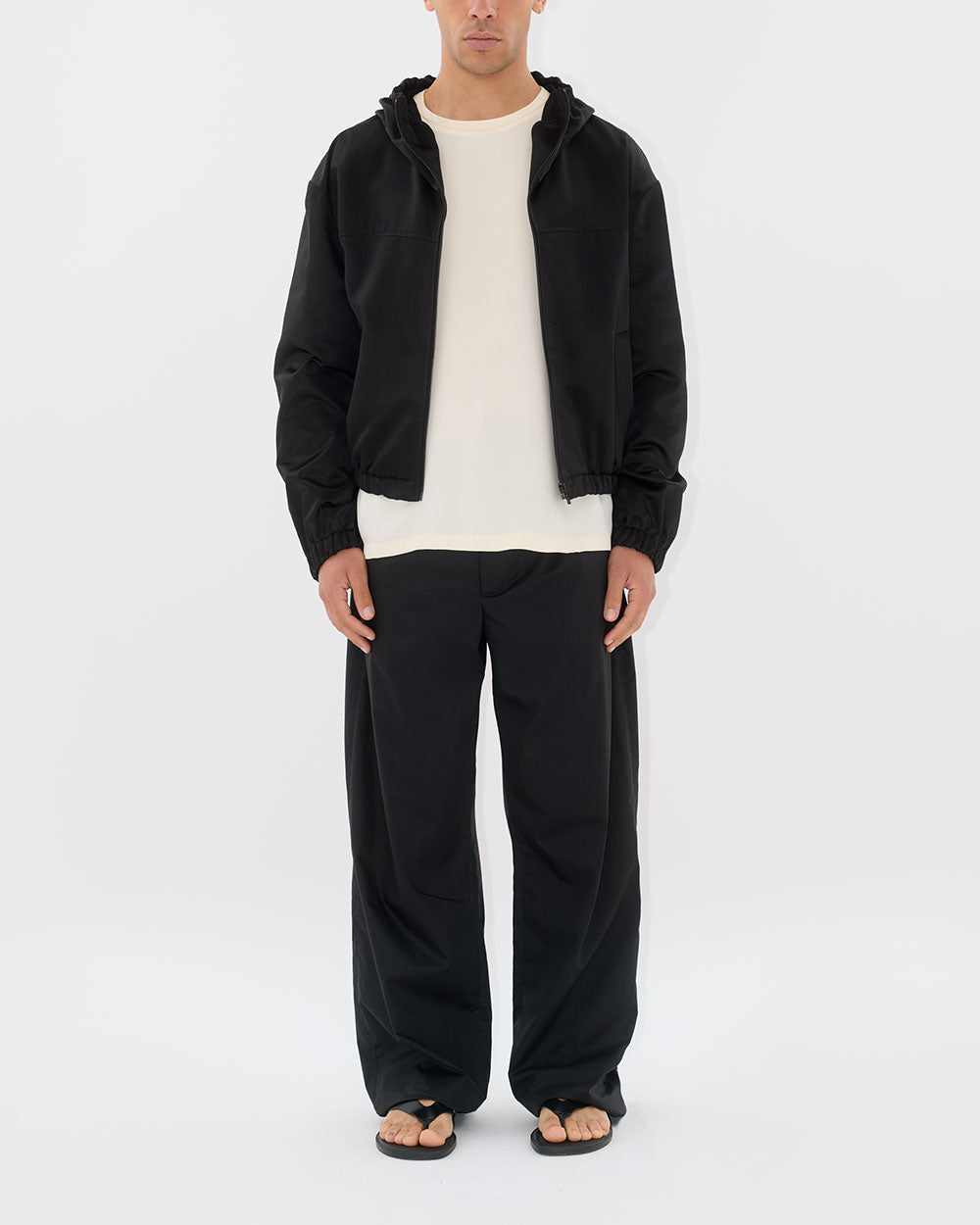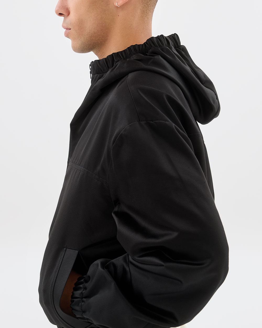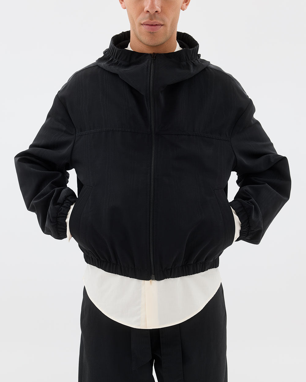 An elevated, effortlessly cool sportswear piece for all genders, this hooded bomber is made with a luxurious, watermarked, 'Moiré' fabric.