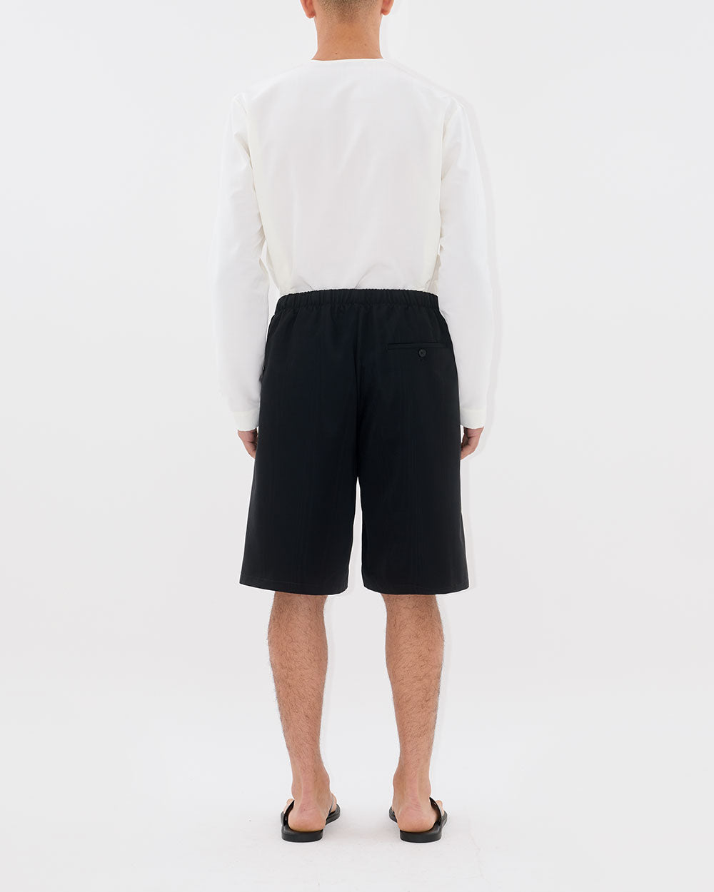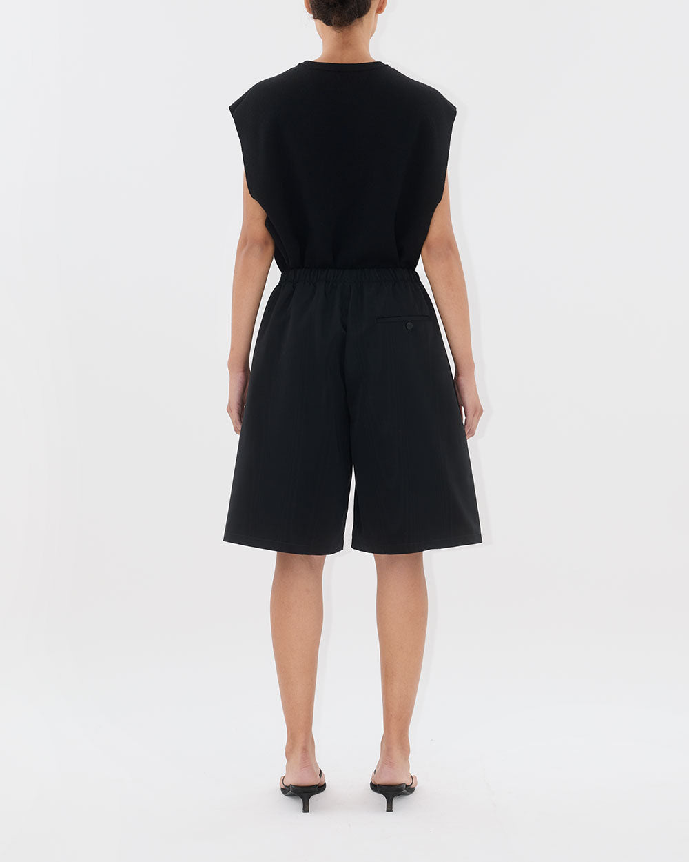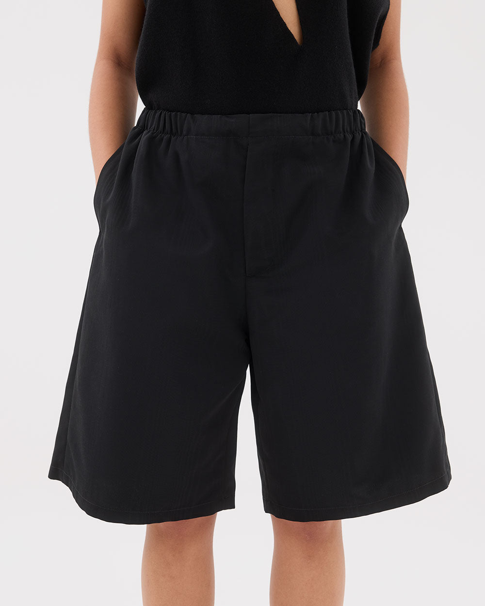 An elasticated waistband short with internal drawstring made in a luxurious watermarked, 'Moiré' fabric.