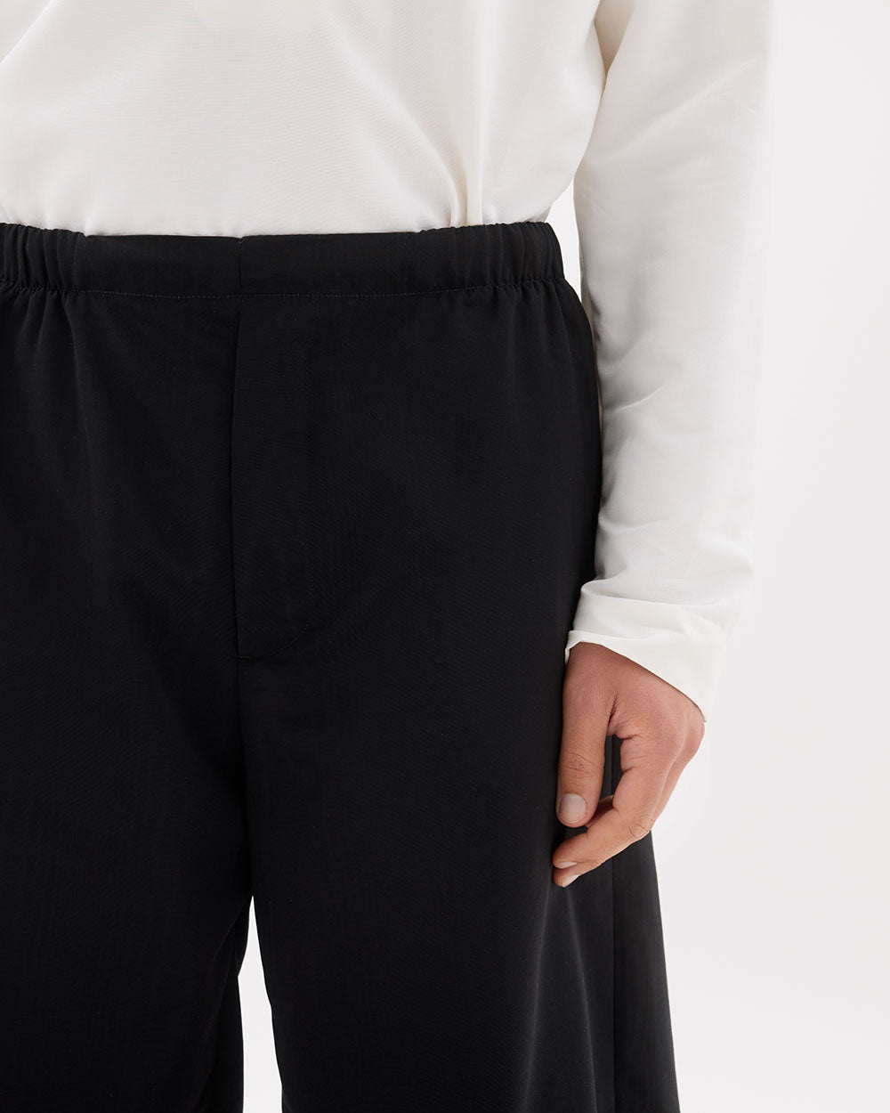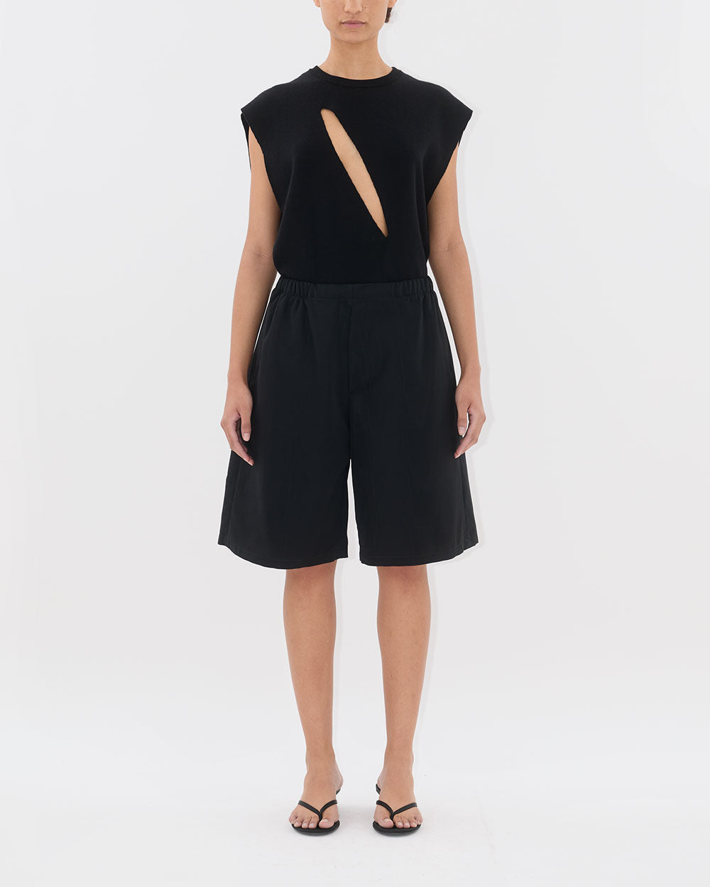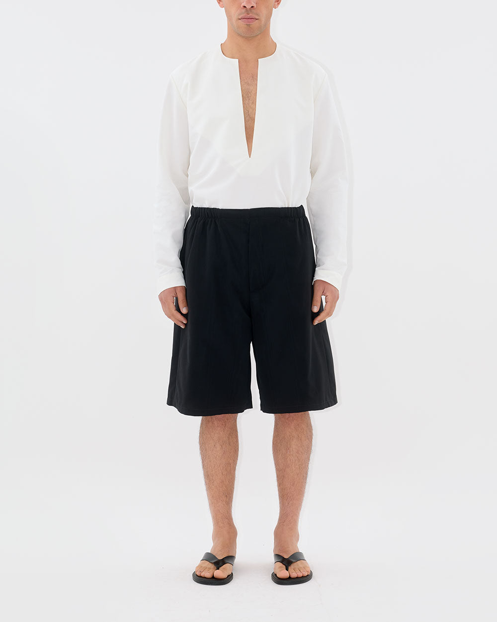 An elasticated waistband short with internal drawstring made in a luxurious watermarked, 'Moiré' fabric.