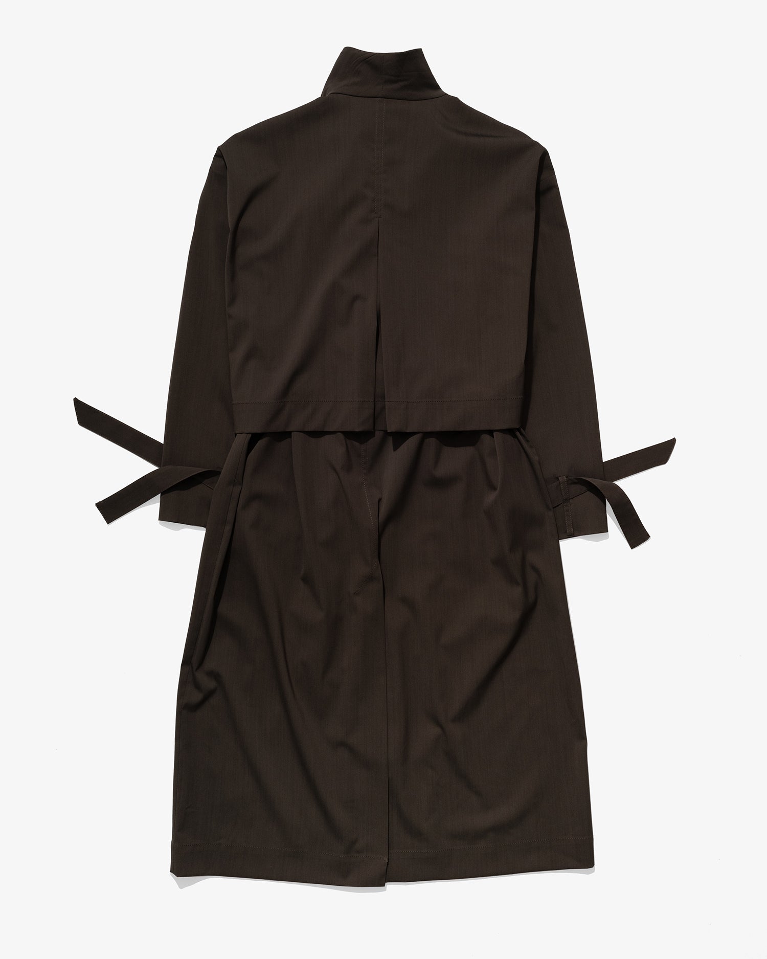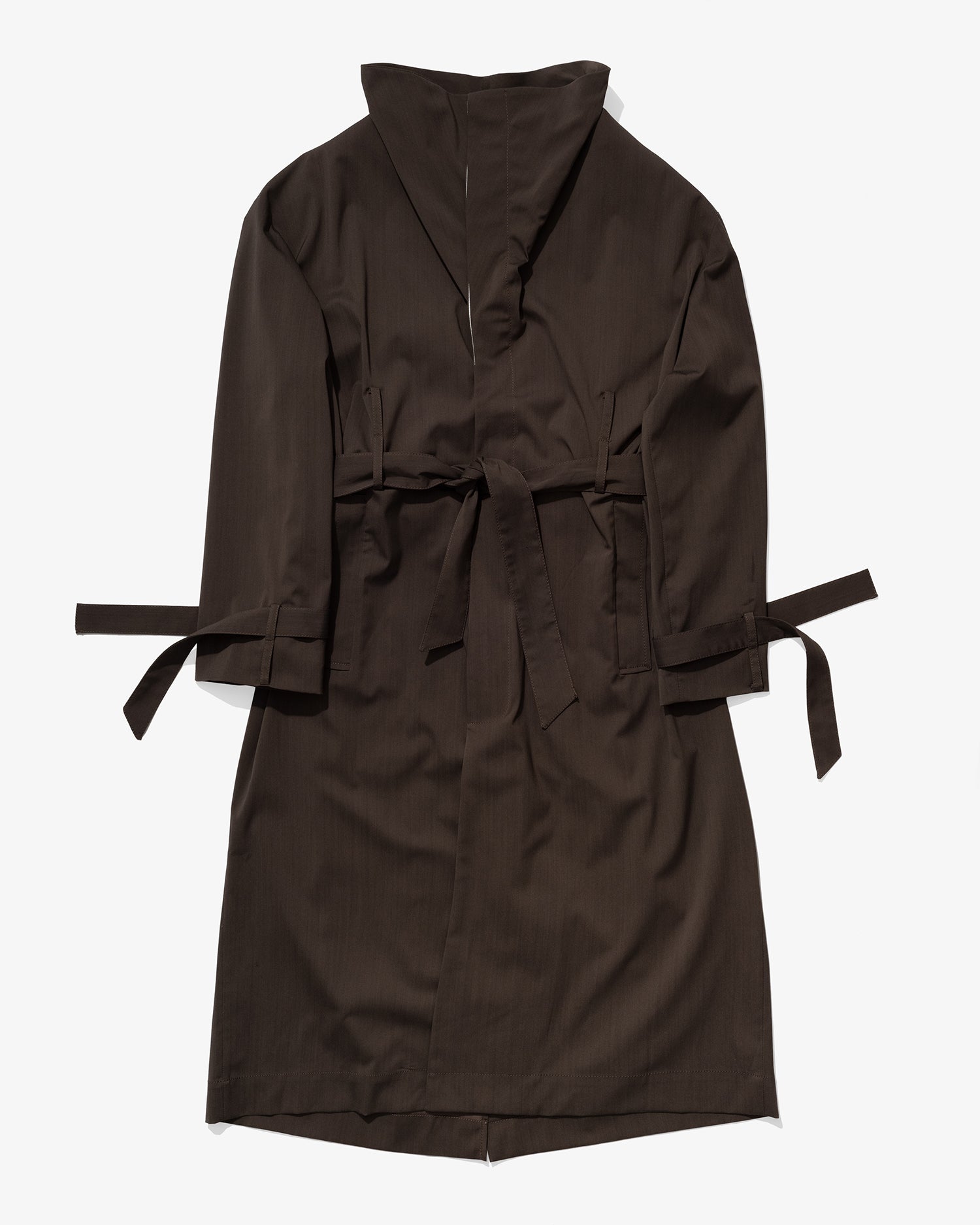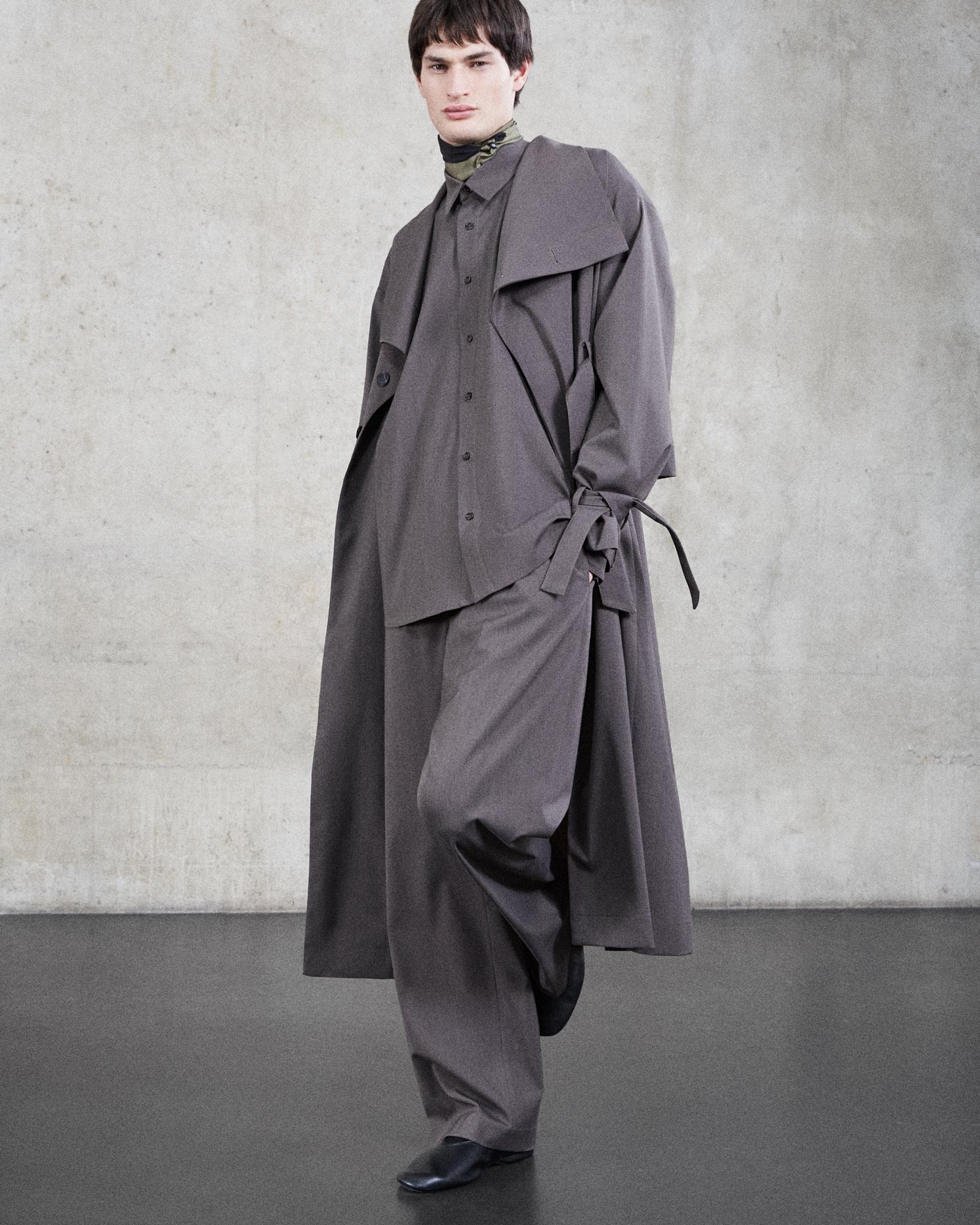 A softly draped wool blend trench coat for all genders with an generous fit and double-tiered belt loop system for varying waist positions.