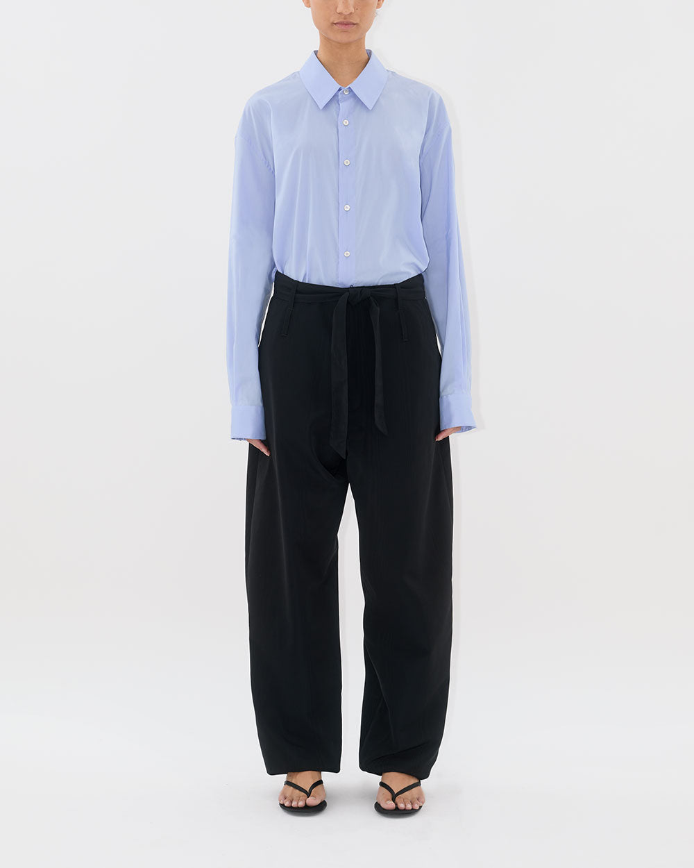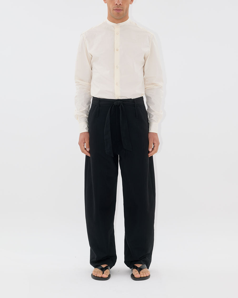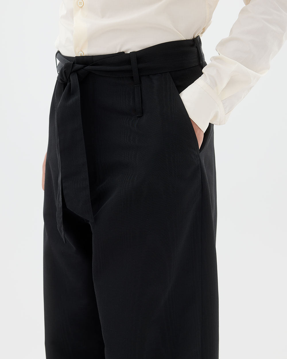 A double-tiered belted trouser for all genders in a luxurious watermarked, 'Moiré' fabric.