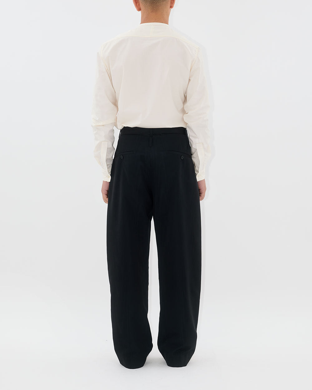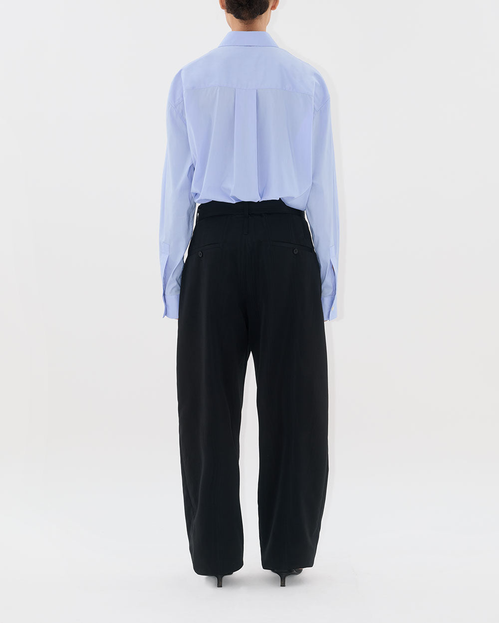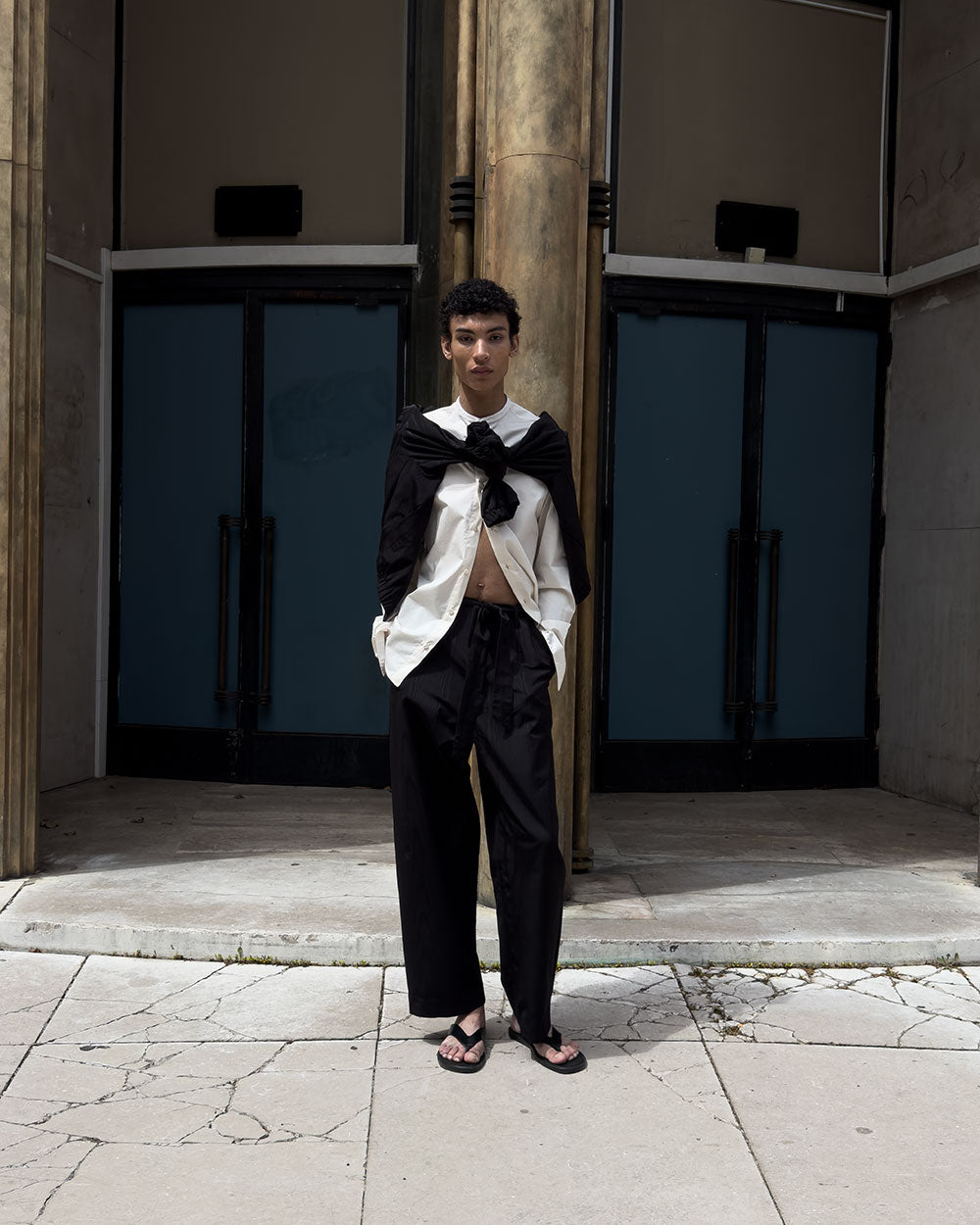 A double-tiered belted trouser for all genders in a luxurious watermarked, 'Moiré' fabric.